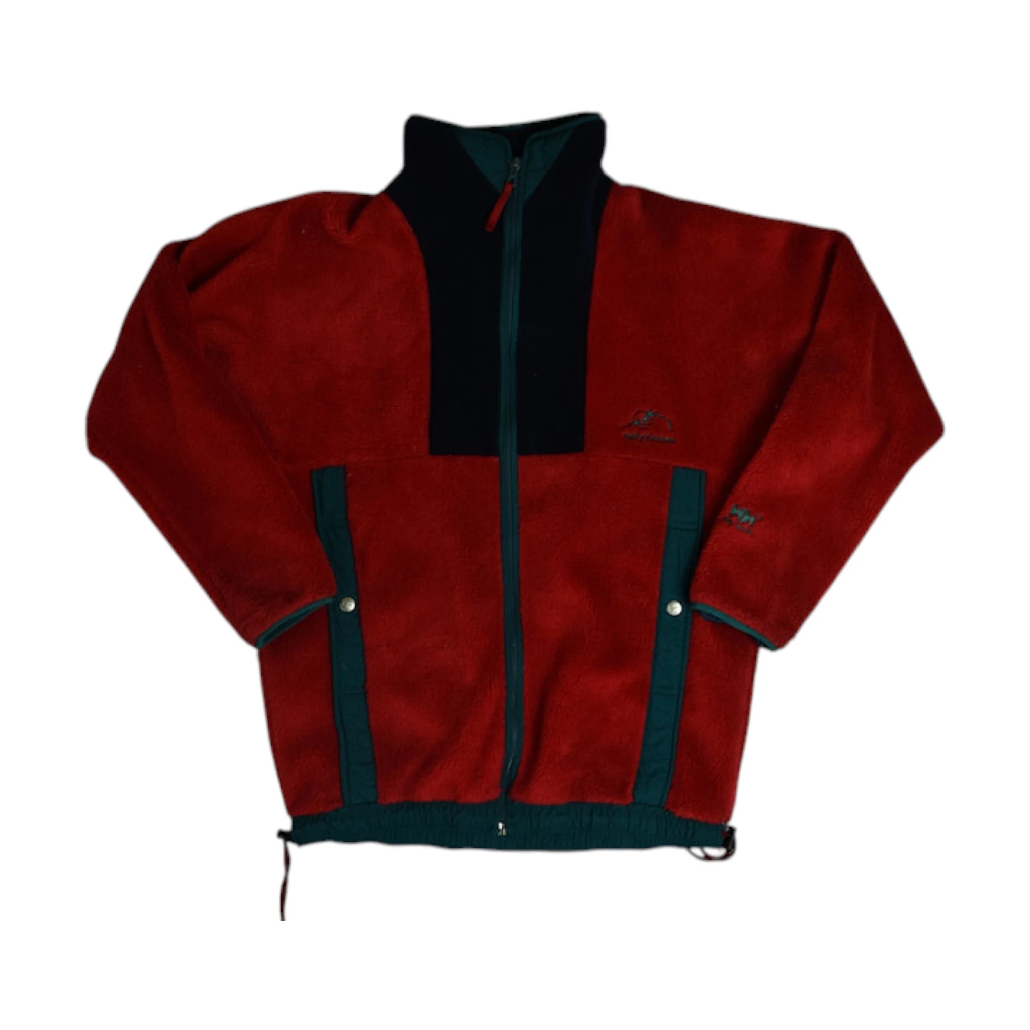 Product details: Red fleece fabric with black and dark green trim, embroidered branding on chest and sleeve, snap-button closures, high neck, adjustable drawstring hem.